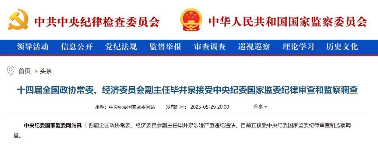 据中央纪委国度监委网站 音尘:十四届天下政协常委、经济委员会副主任毕井泉涉嫌严重违规行恶开云体育(中国)官方网站,现在矜重受中央纪委国度监委顺序审查和监察看望。