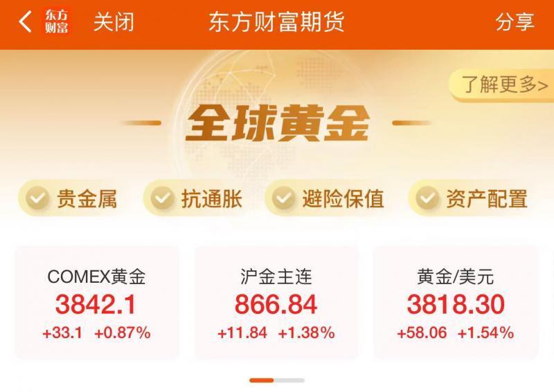 而本周一,现货黄金价钱短暂大幅攀升。放胆发稿时,现货黄金照旧涨超1.5%,最高报3819.8好意思元/盎司。同期,COMEX黄金期货周一也由跌转涨,涨幅接近1%,最高报3848.8好意思元/盎司。
