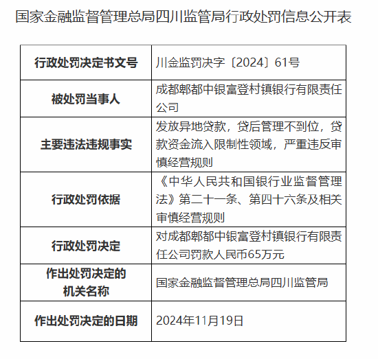11月26日金融一线音信,国度金融监督不断总局四川监管局行政处罚信息公开表表示,成王人郫王人中银富登村镇银行有限包袱公司因披发他乡贷款,贷后不断不到位,贷款资金流入欺压性限制,严重违背审慎运筹帷幄律例,被罚金65万元。